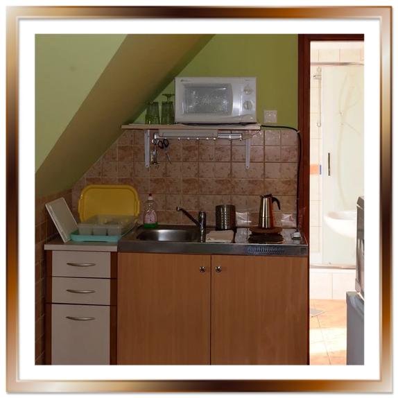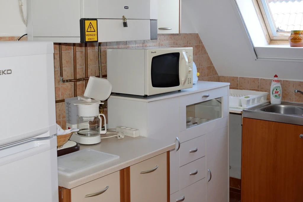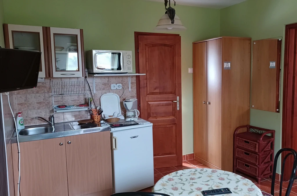 - Komplett konyha: főzőlap, hűtő, mikrohullámú sütő, vízforraló, edények és evőeszközök