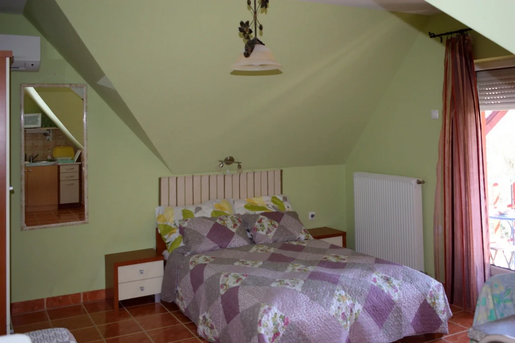 Három modern stúdió, 3x2 fő részére. Saját fürdő, teljesen felszerelt konyha, LED TV, gyors Wi‑Fi. Csendes környezet, rövid sétára a strandtól és a központtól.