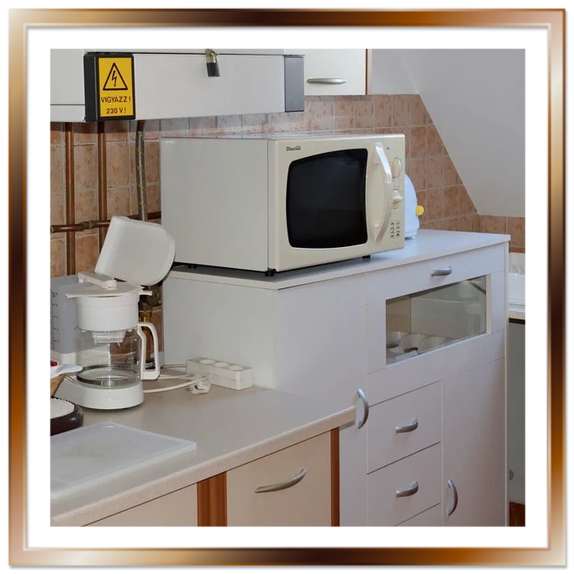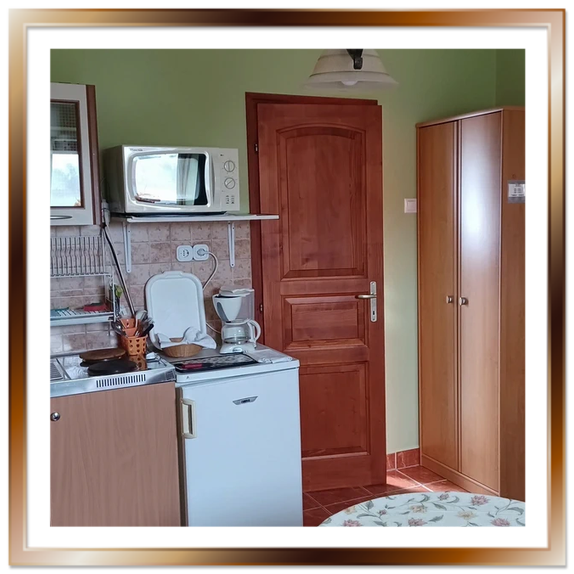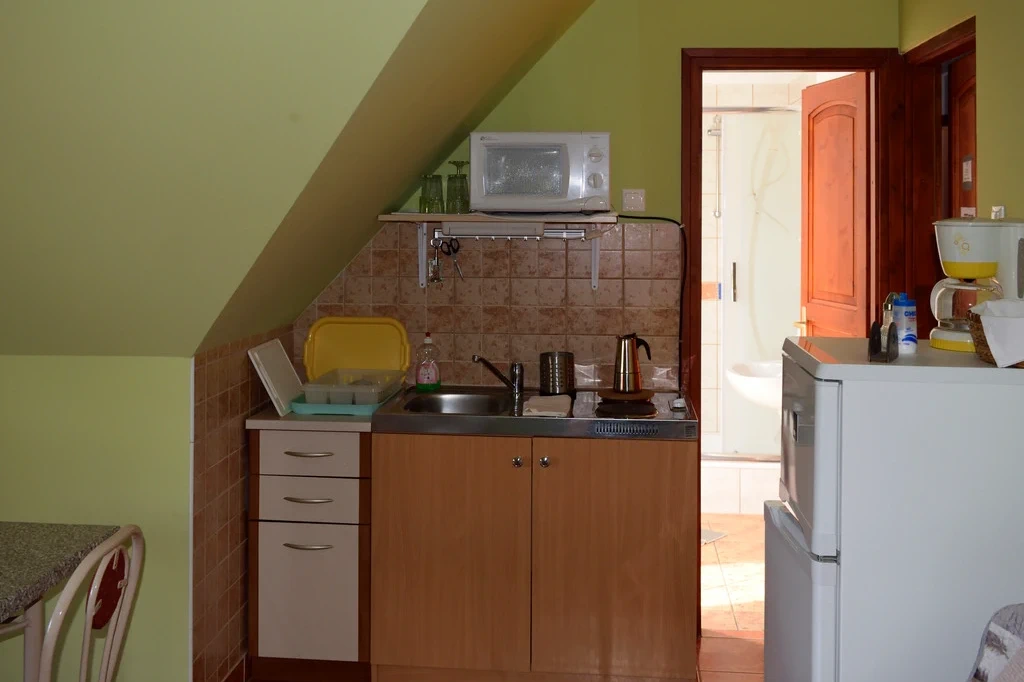 - Komplett konyha: főzőlap, hűtő, mikrohullámú sütő, vízforraló, edények és evőeszközök