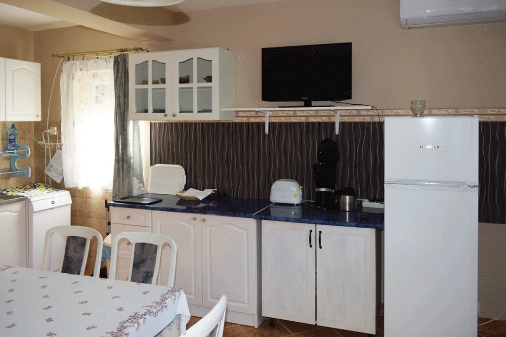 - Komplett konyha: gáztűzhely, hűtő, mikró, vízforraló, edények és étkészlet, mosogatógép, stb.